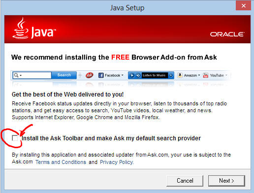 Very Important: Whenever installing Java or Java updates make sure to uncheck the option to install and toolbars or other add-ons. These add-ons pay Oracle to be installed with Java but may cause problems for your computer.